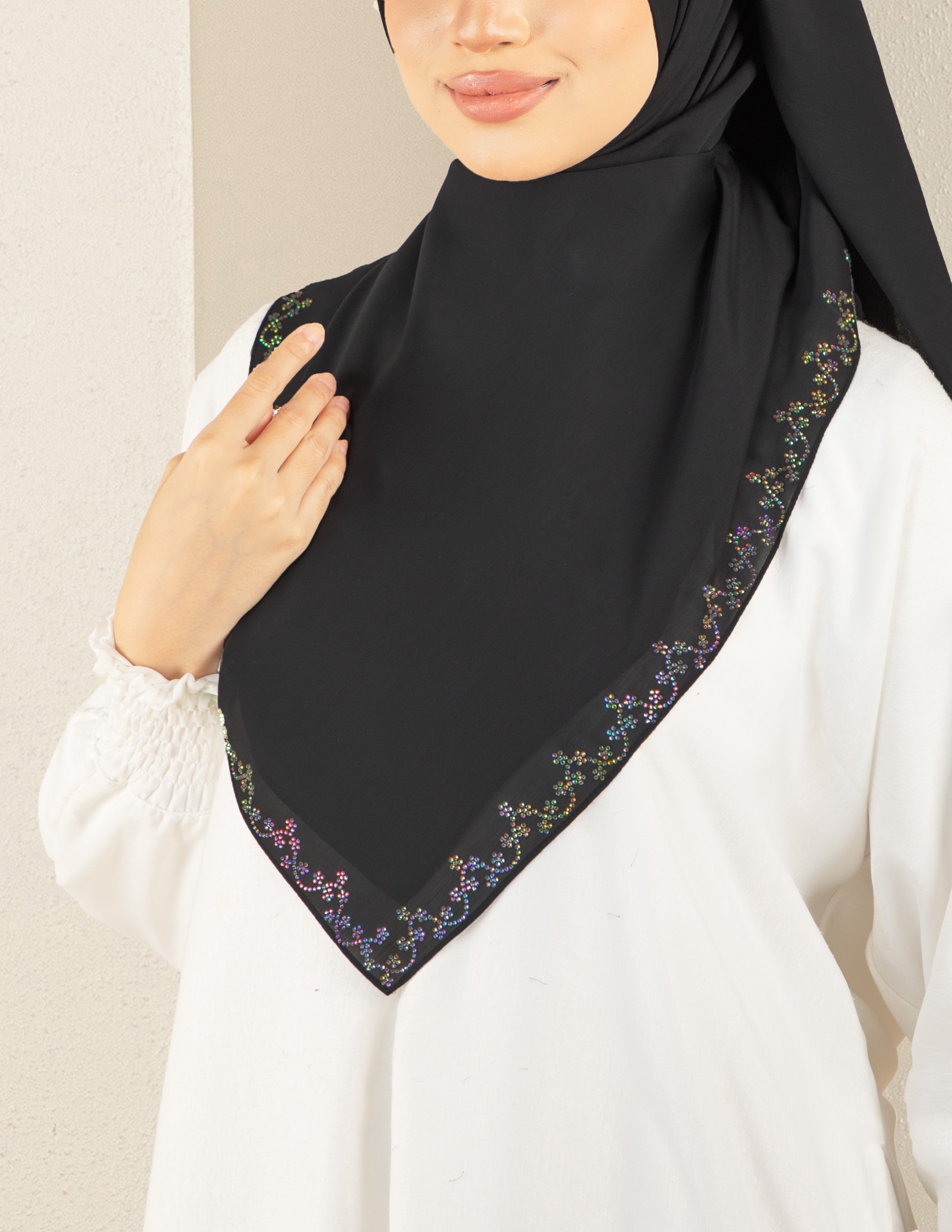 Kemasan Korean Stone yang halus di bahagian tepi menambah elemen mewah dan eksklusif tanpa kelihatan berlebihan, menjadikan Bawal Ratu sesuai digayakan untuk penampilan kasual elegan atau majlis formal. Saiz bidang 48 memberikan liputan yang sempurna, mudah dibentuk dan kemas sepanjang pemakaian.