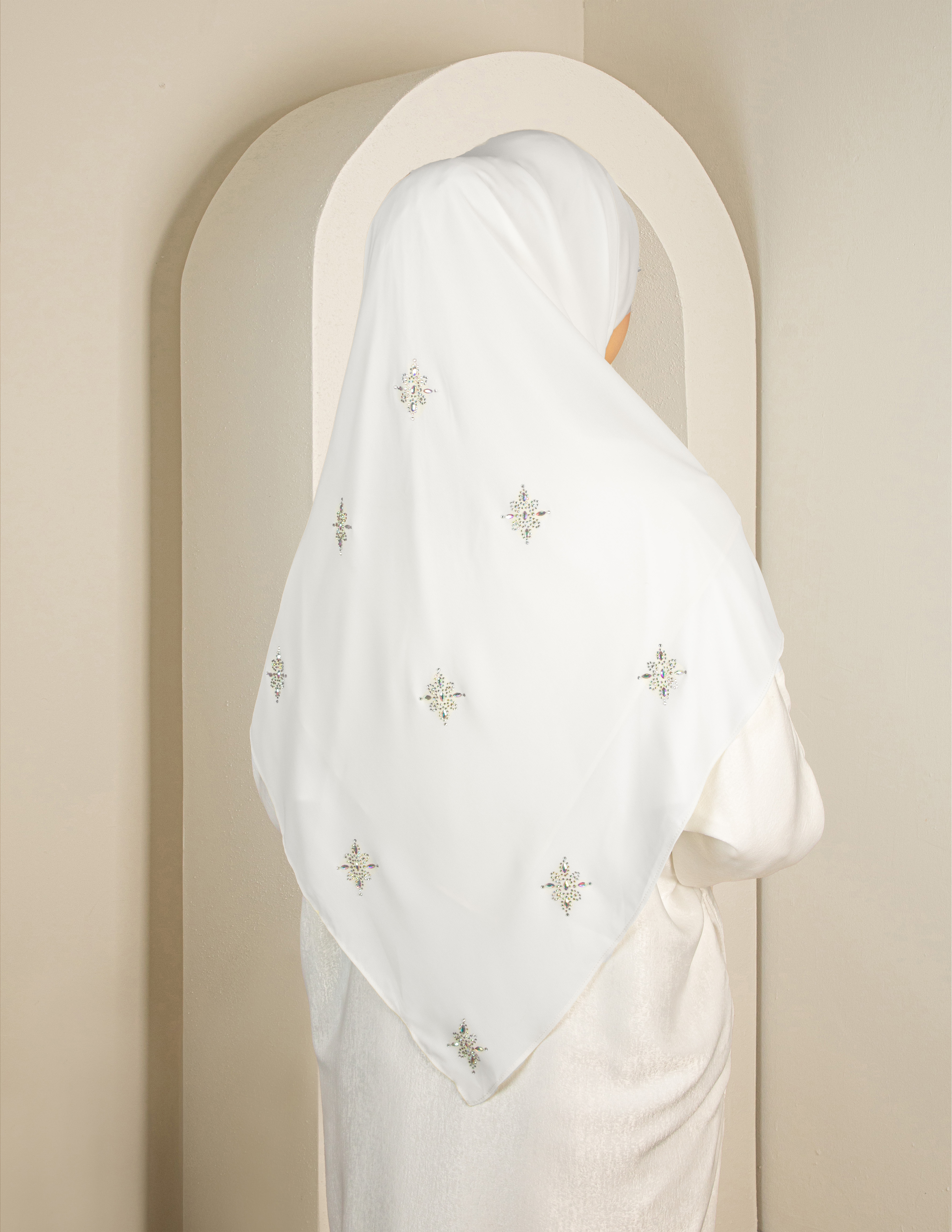 Keistimewaan utama koleksi ini dihiasi dengan kemasan Korean Stone (Diamond) yang dipasang dengan teliti, menghasilkan efek kilauan eksklusif yang menaikkan seri wajah pemakai. Digabungkan bersama awning Lycra yang lembut, anjal dan selesa, ia memastikan pemakaian yang kemas tanpa rasa ketat di bahagian dahi.