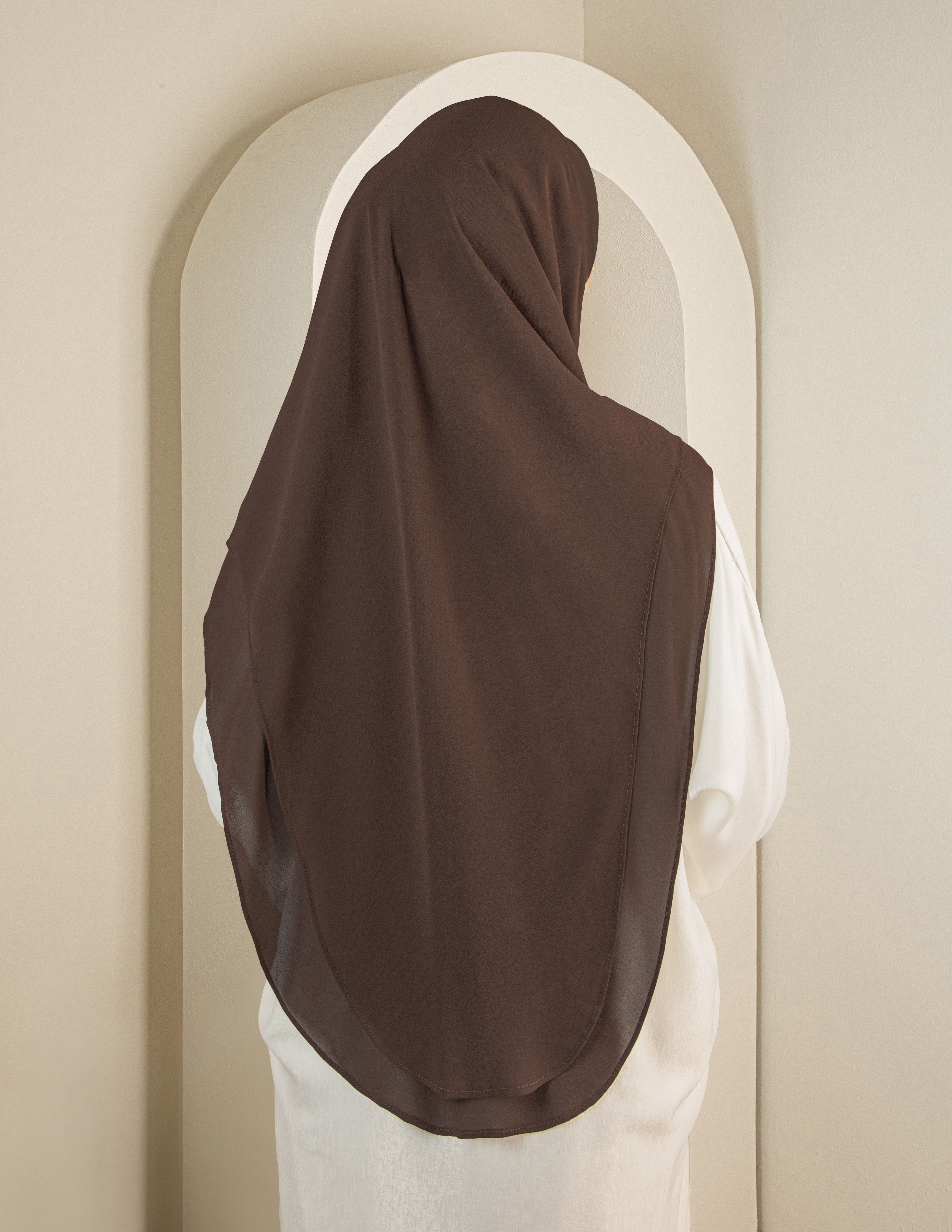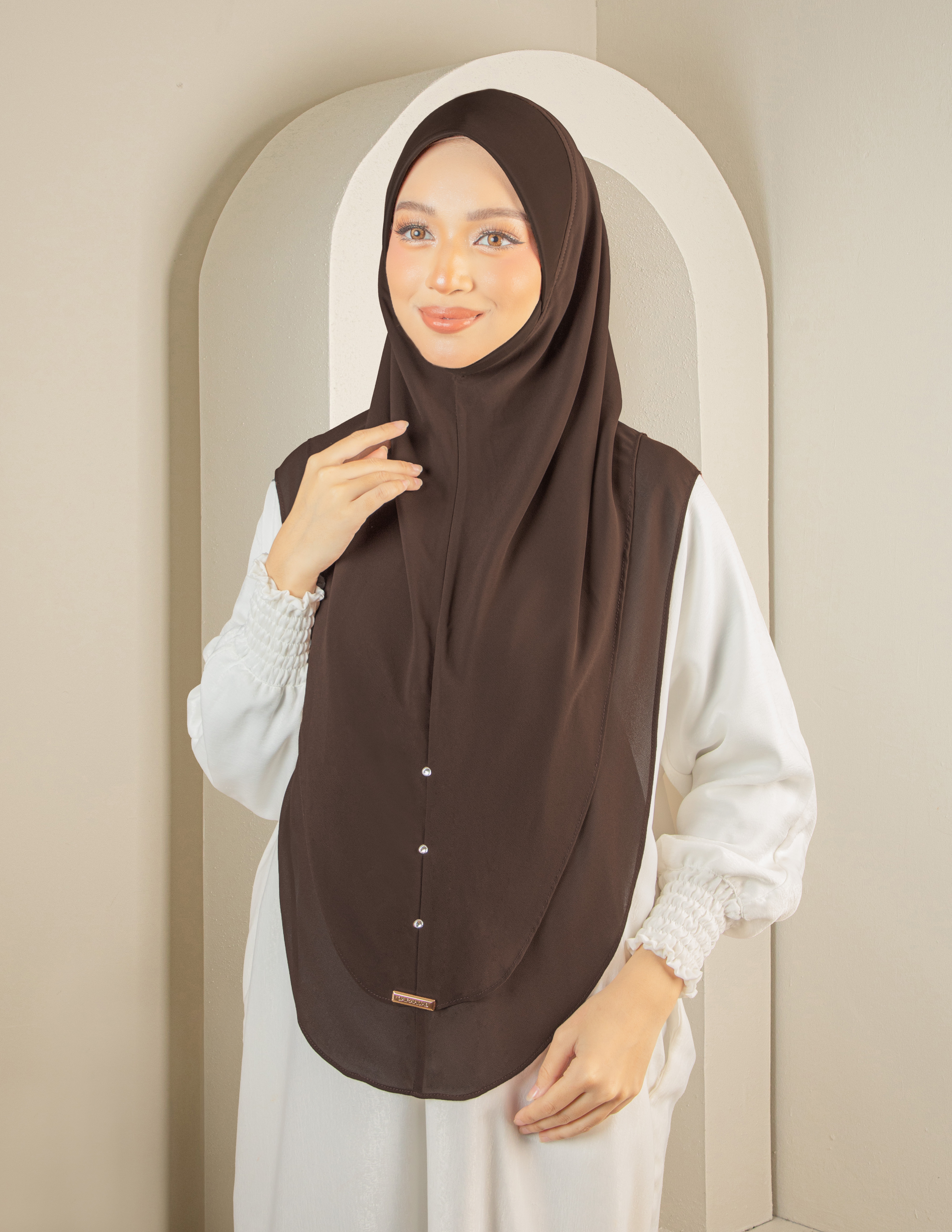 Bahagian badan menggunakan Chiffon Georgette yang lembut dan flowy, digabungkan dengan awning serta chin cover daripada Scuba bagi memastikan bentuk sentiasa stabil dan kemas tanpa perlu pelarasan berlebihan. Rekaan ini sesuai untuk wanita berkerjaya yang inginkan penampilan terurus dari pagi hingga ke petang dan mudah untuk buat solat.
