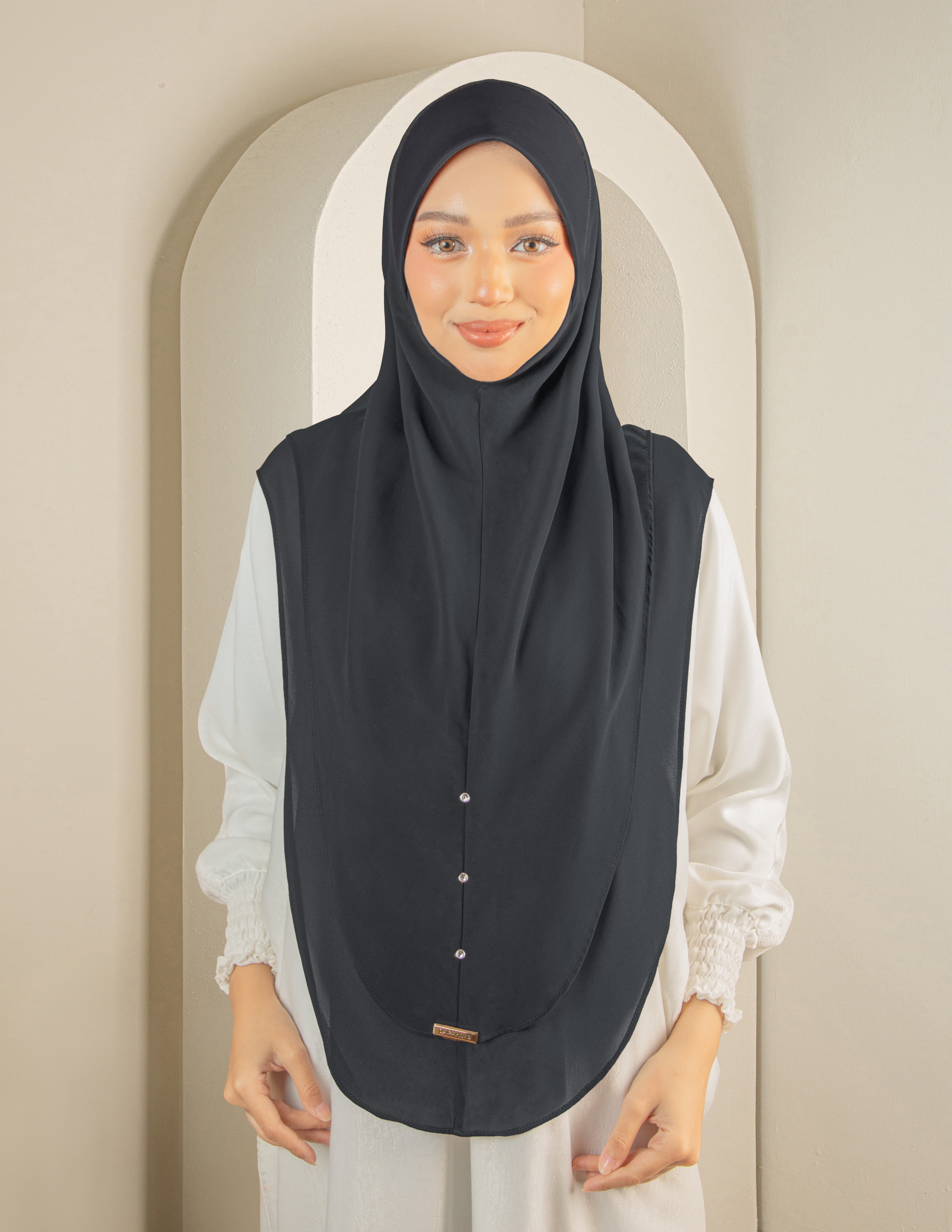 Bahagian badan menggunakan Chiffon Georgette yang lembut dan flowy, digabungkan dengan awning serta chin cover daripada Scuba bagi memastikan bentuk sentiasa stabil dan kemas tanpa perlu pelarasan berlebihan. Rekaan ini sesuai untuk wanita berkerjaya yang inginkan penampilan terurus dari pagi hingga ke petang dan mudah untuk buat solat.