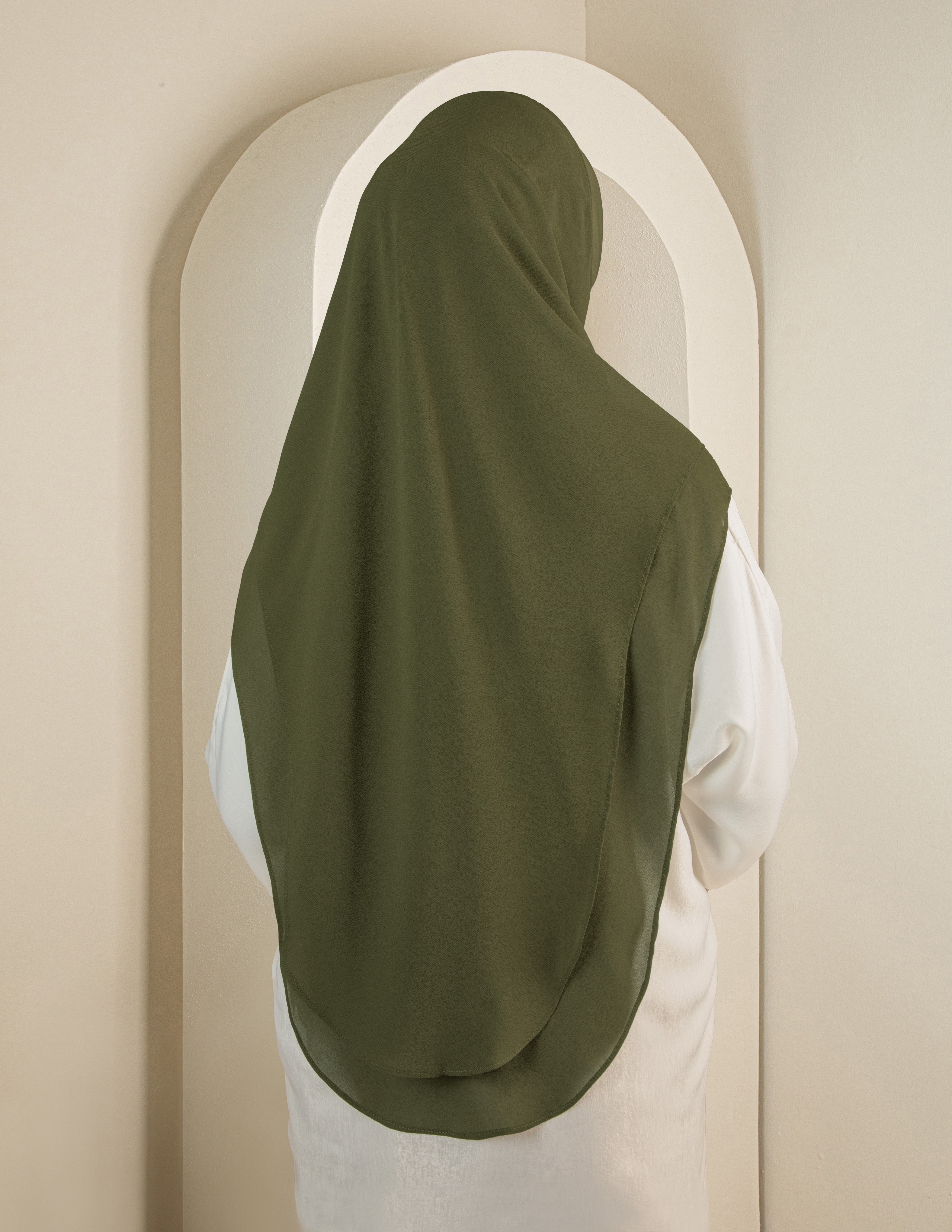 Bahagian badan menggunakan Chiffon Georgette yang lembut dan flowy, digabungkan dengan awning serta chin cover daripada Scuba bagi memastikan bentuk sentiasa stabil dan kemas tanpa perlu pelarasan berlebihan. Rekaan ini sesuai untuk wanita berkerjaya yang inginkan penampilan terurus dari pagi hingga ke petang dan mudah untuk buat solat.