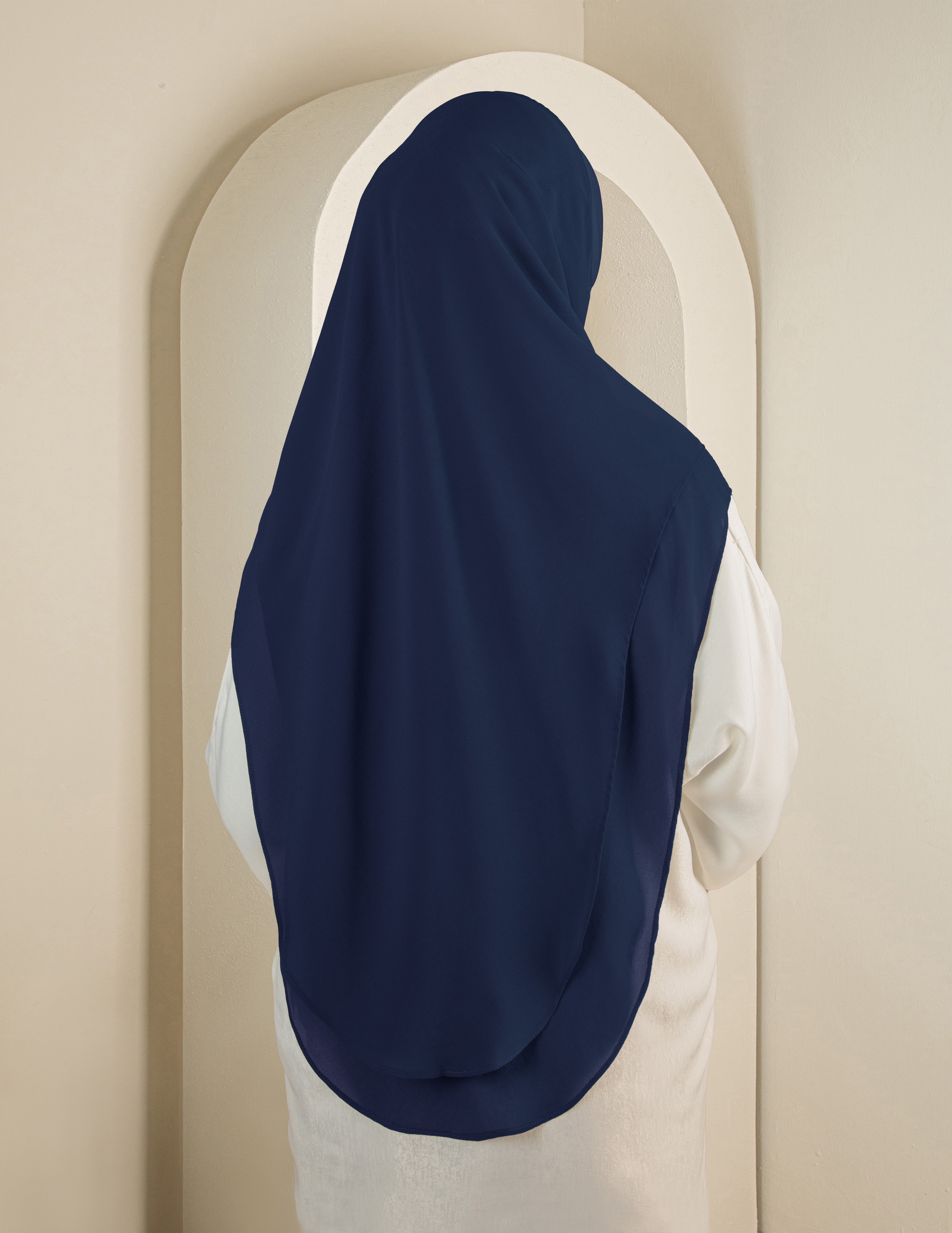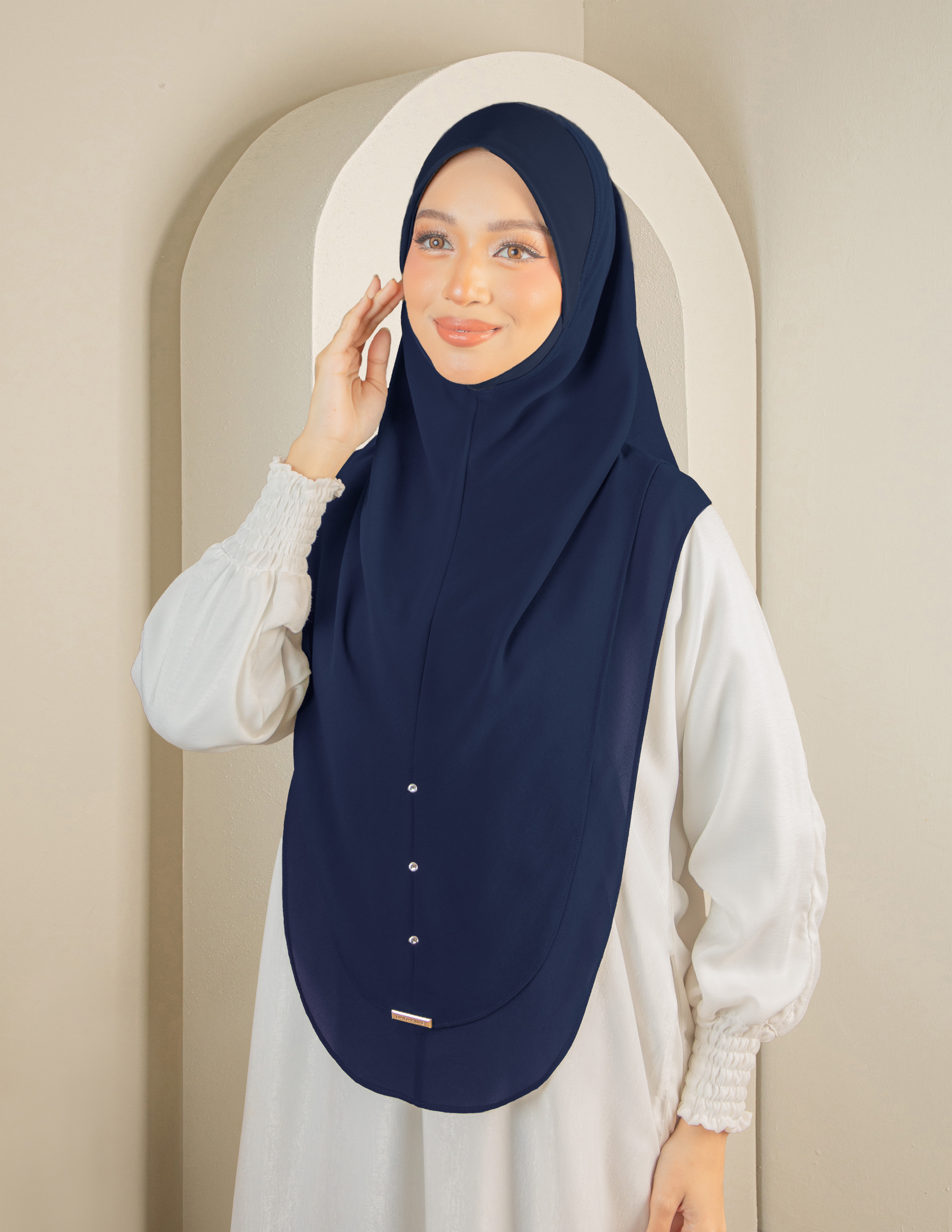 Bahagian badan menggunakan Chiffon Georgette yang lembut dan flowy, digabungkan dengan awning serta chin cover daripada Scuba bagi memastikan bentuk sentiasa stabil dan kemas tanpa perlu pelarasan berlebihan. Rekaan ini sesuai untuk wanita berkerjaya yang inginkan penampilan terurus dari pagi hingga ke petang dan mudah untuk buat solat.
