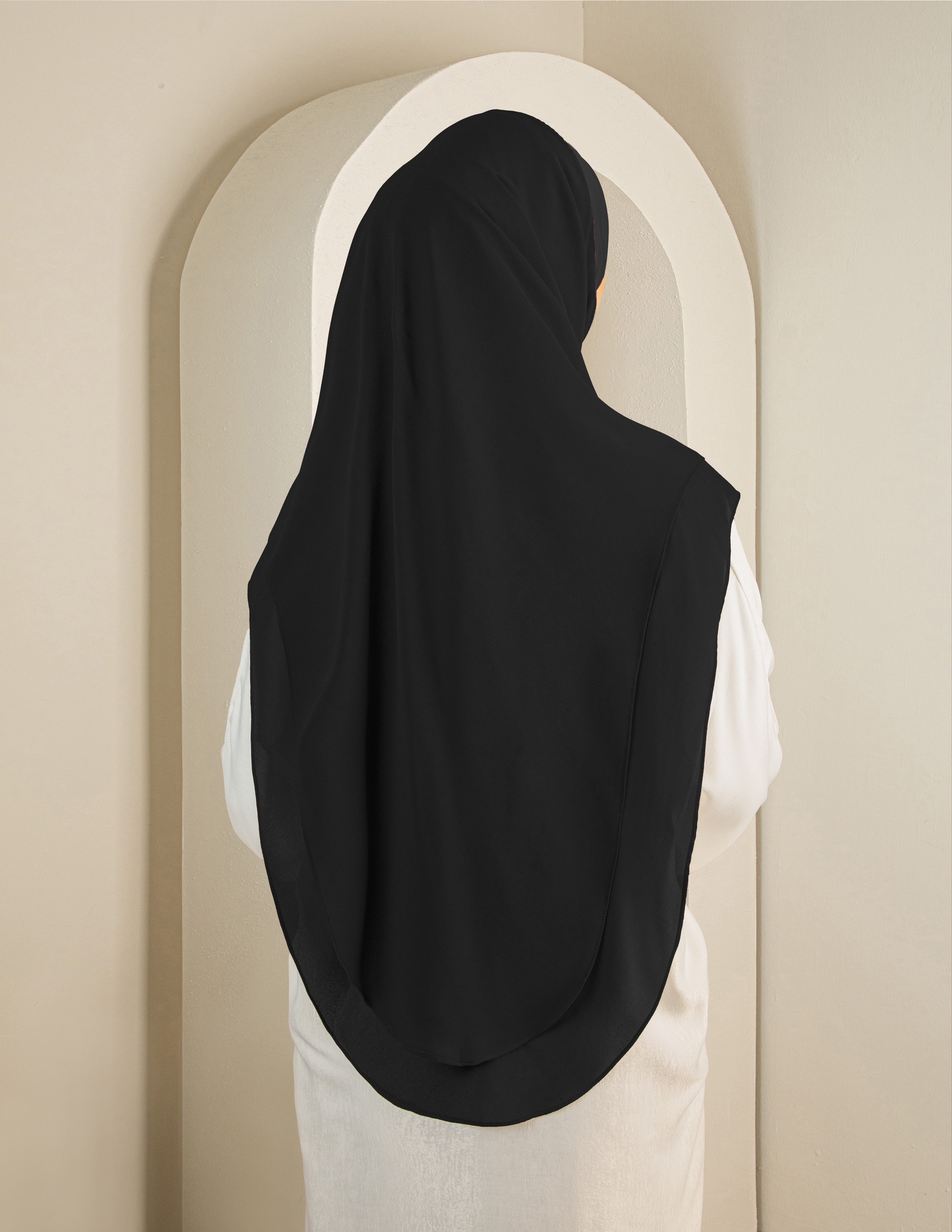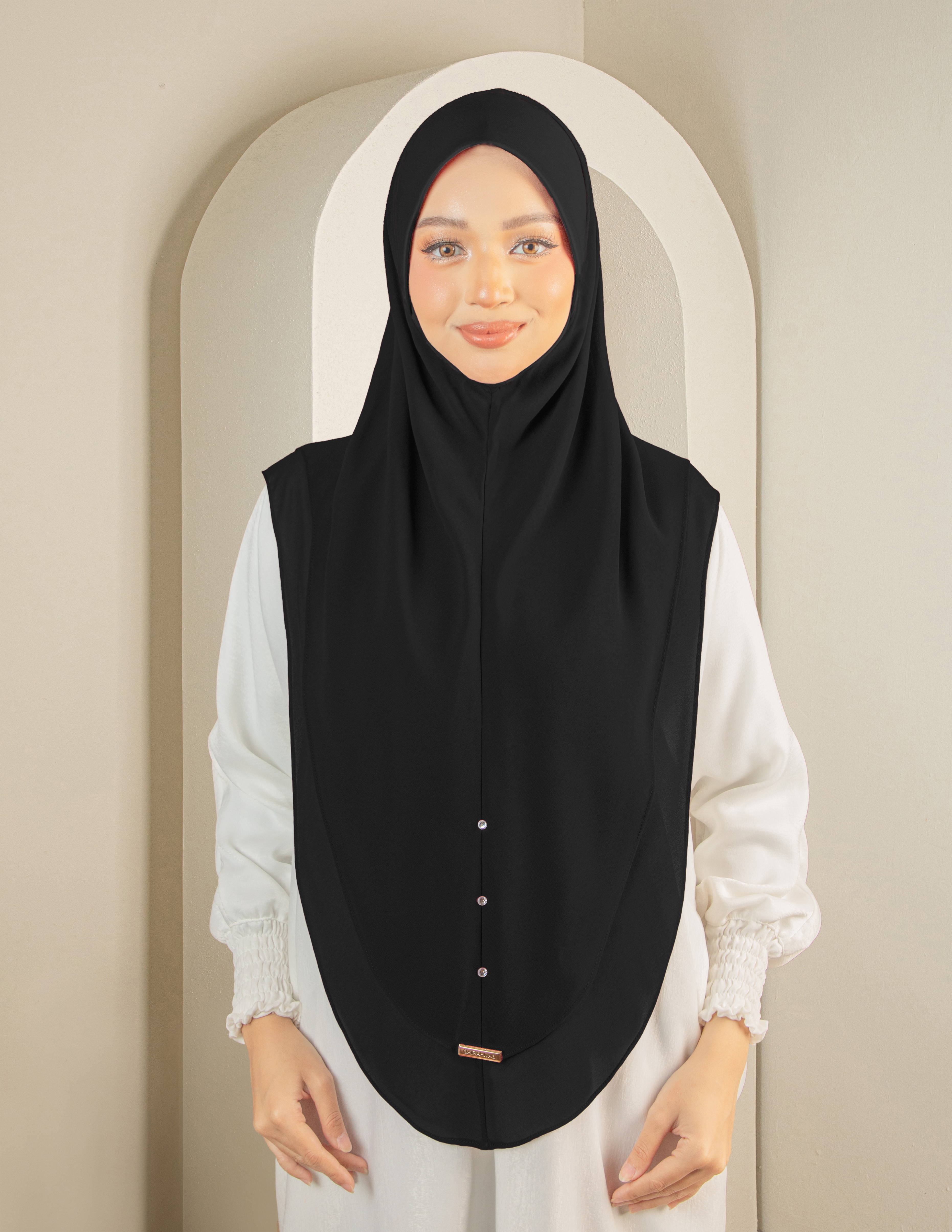 Bahagian badan menggunakan Chiffon Georgette yang lembut dan flowy, digabungkan dengan awning serta chin cover daripada Scuba bagi memastikan bentuk sentiasa stabil dan kemas tanpa perlu pelarasan berlebihan. Rekaan ini sesuai untuk wanita berkerjaya yang inginkan penampilan terurus dari pagi hingga ke petang dan mudah untuk buat solat.