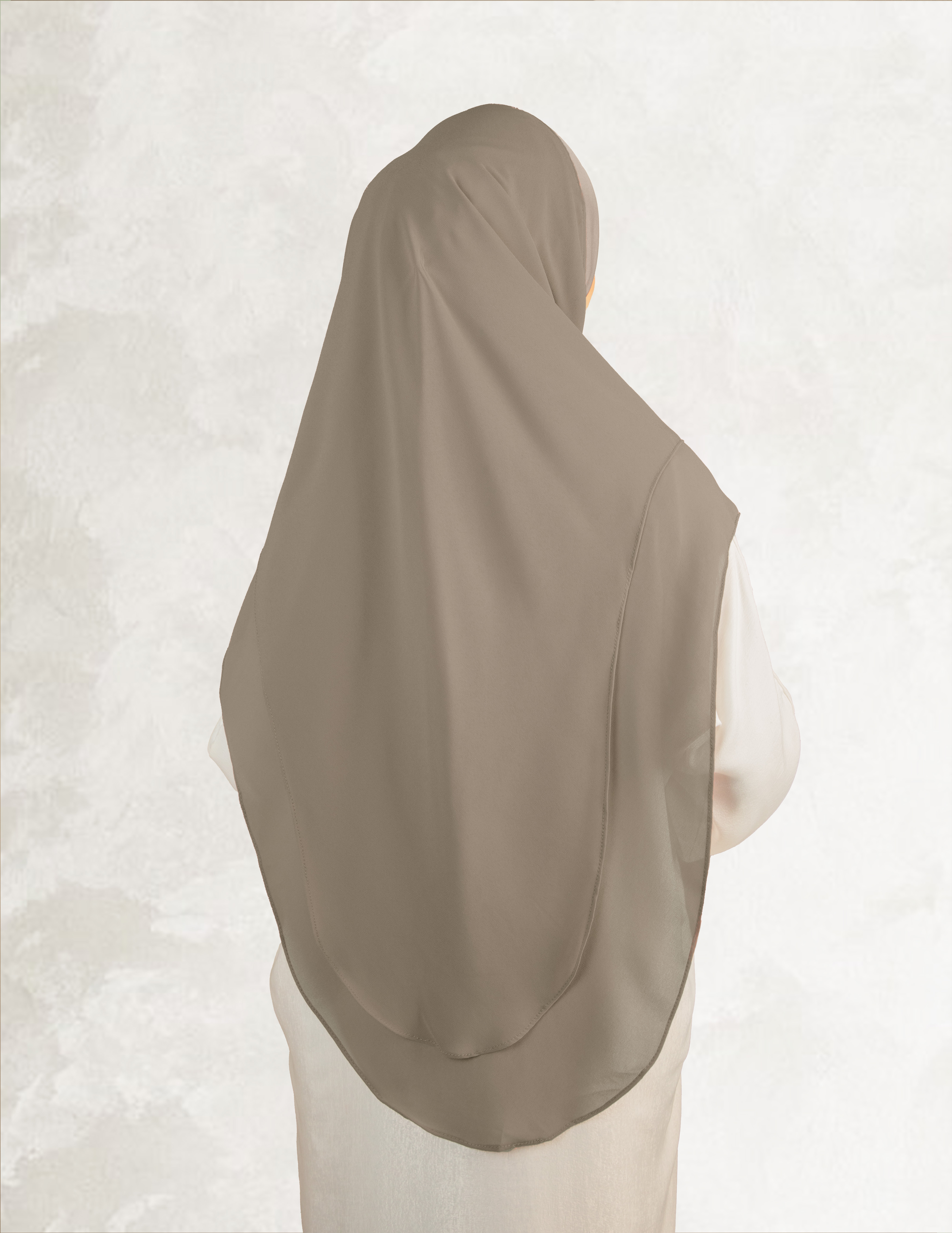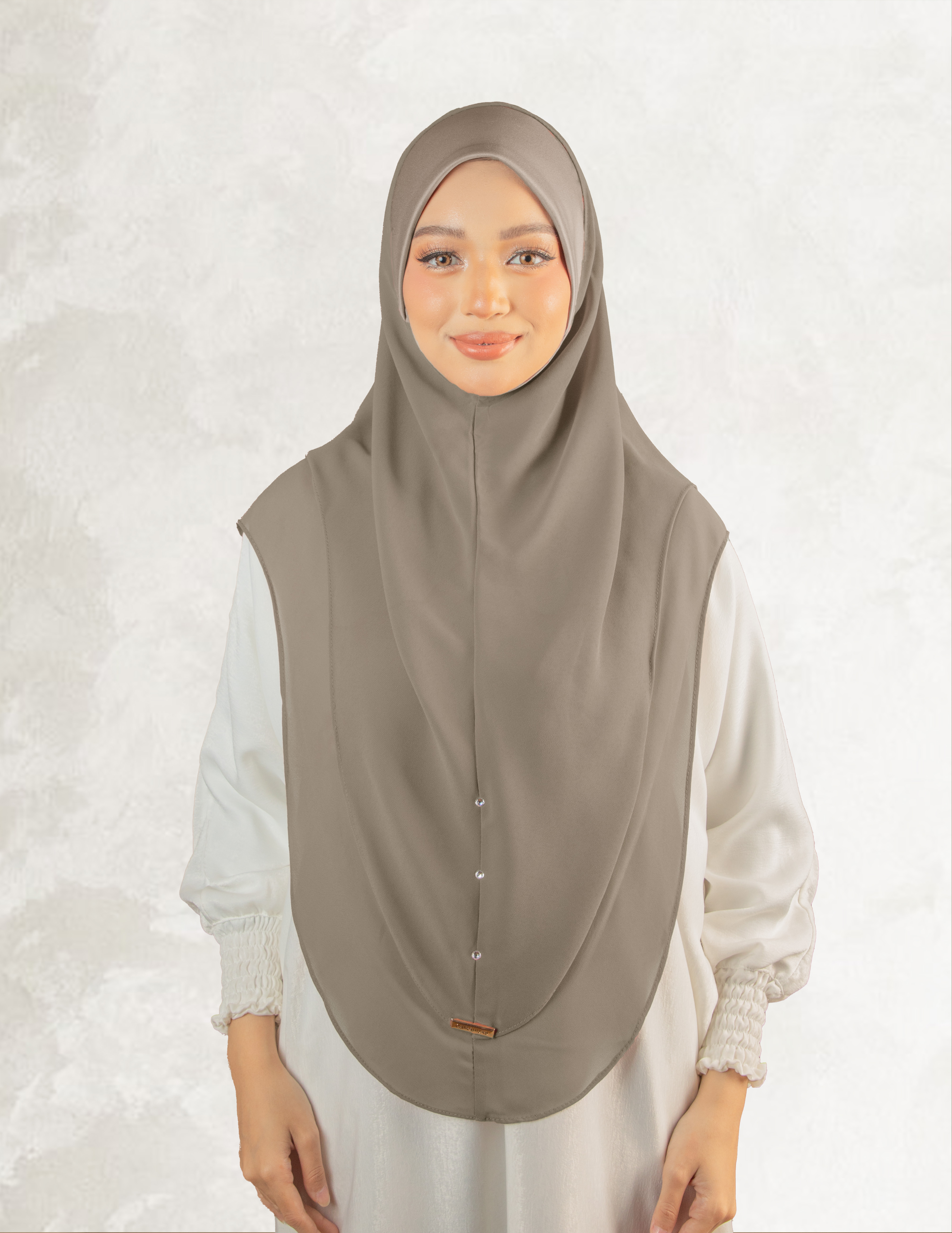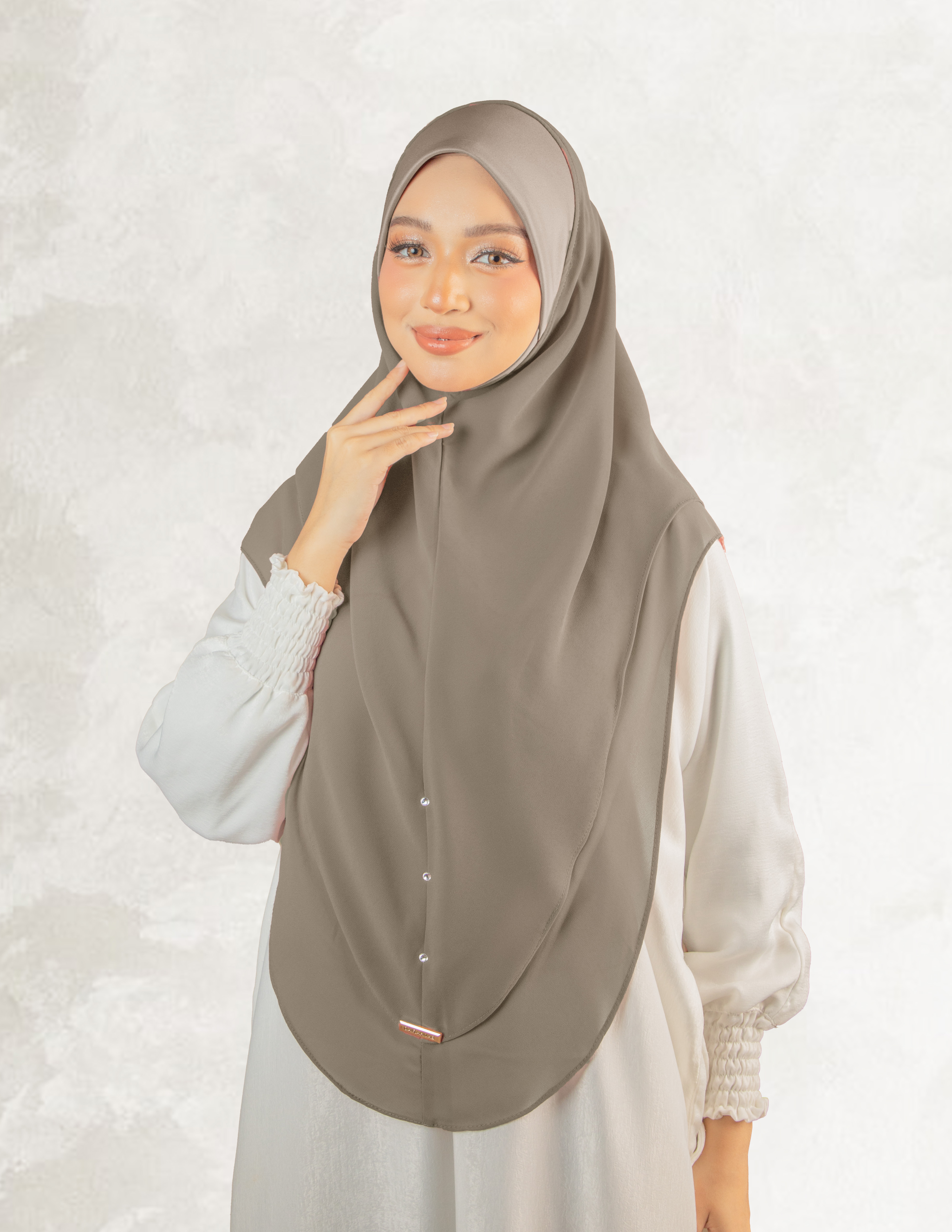 Bahagian badan menggunakan Chiffon Georgette yang lembut dan flowy, digabungkan dengan awning serta chin cover daripada Scuba bagi memastikan bentuk sentiasa stabil dan kemas tanpa perlu pelarasan berlebihan. Rekaan ini sesuai untuk wanita berkerjaya yang inginkan penampilan terurus dari pagi hingga ke petang dan mudah untuk buat solat.