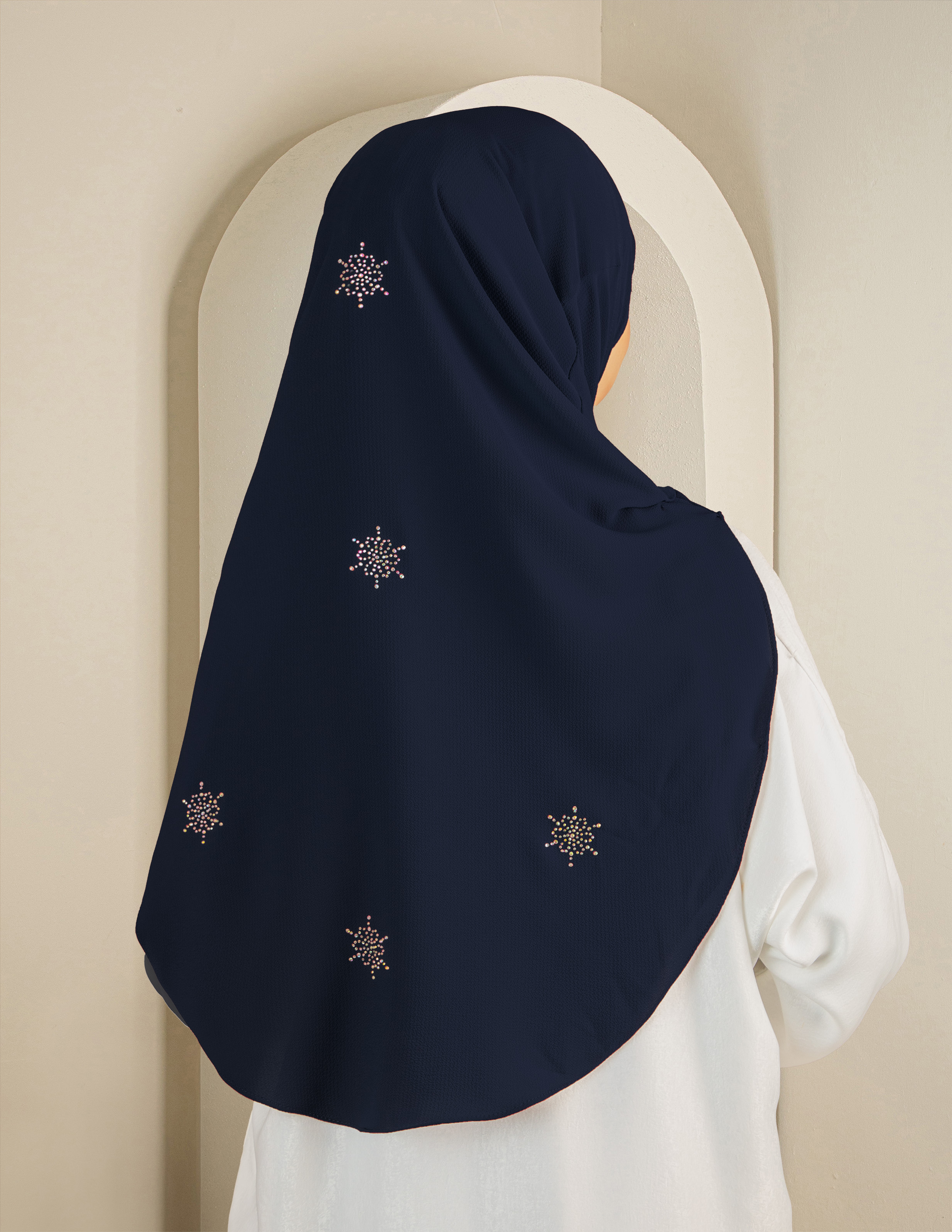 Rekaan dengan perincian korean stone yang elegan dan eksklusif, menjadikan Syarifah Plain sesuai digayakan untuk kegunaan harian, ke pejabat, majlis formal mahupun acara istimewa. Potongan tudung direka dengan ukuran yang seimbang untuk memberikan liputan yang baik di bahagian dagu, dada dan belakang tanpa menjejaskan keselesaan pemakai.